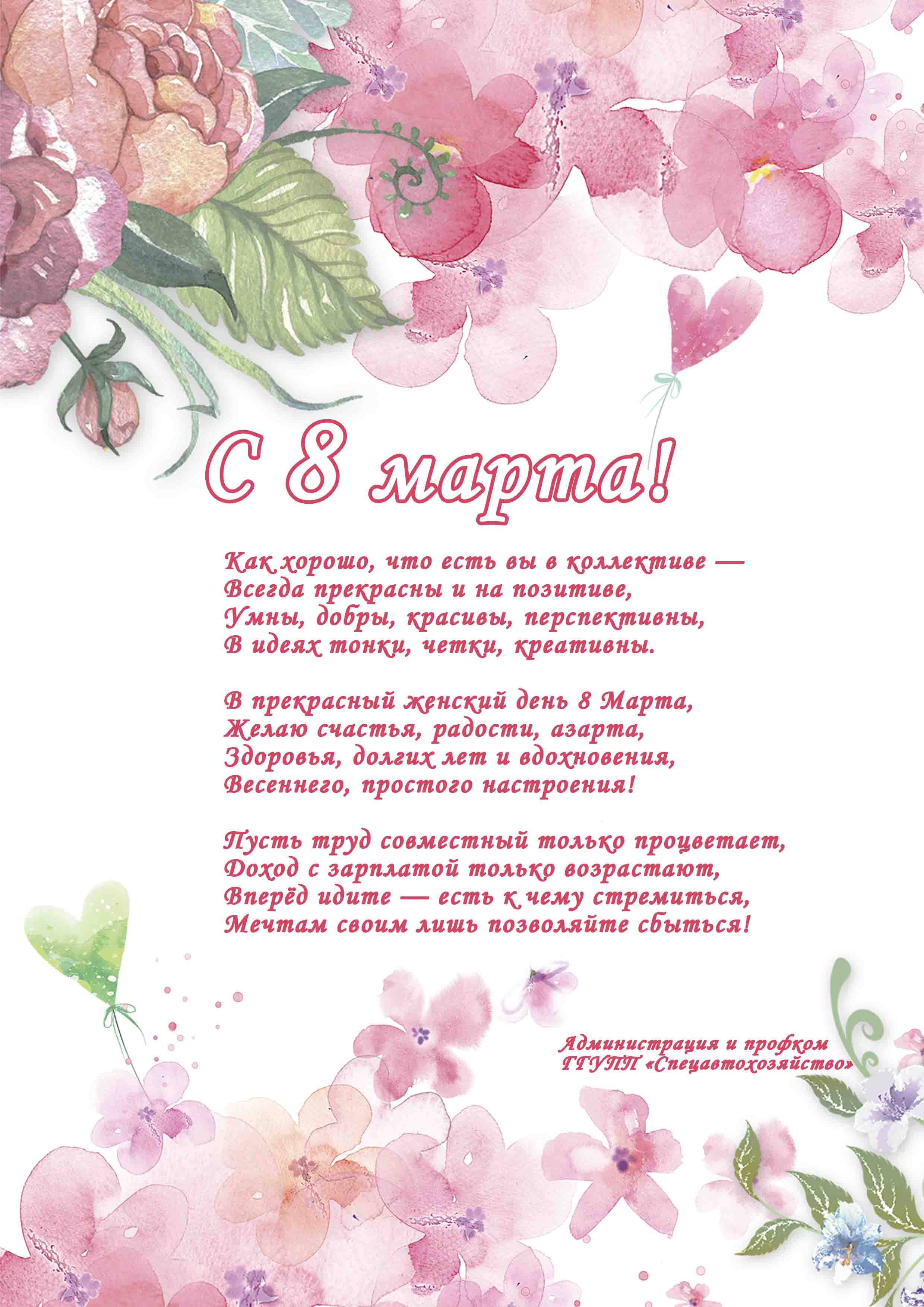 Примите самые искренние поздравления с Международным женским днем от первичной профсоюзной организации и администрации ГГУПП «Спецавтохозяйство». В этот прекрасный весенний праздник желаем всем женщинам огромного счастья, озорного блеска в глазах, душевной теплоты. Пусть всё складывается именно так, как Вам хочется, и пусть Вселенная ни на миг не откладывает исполнение Ваших желаний!
